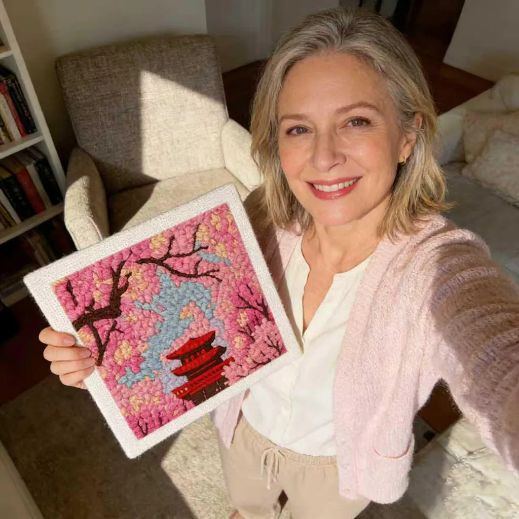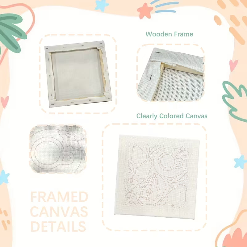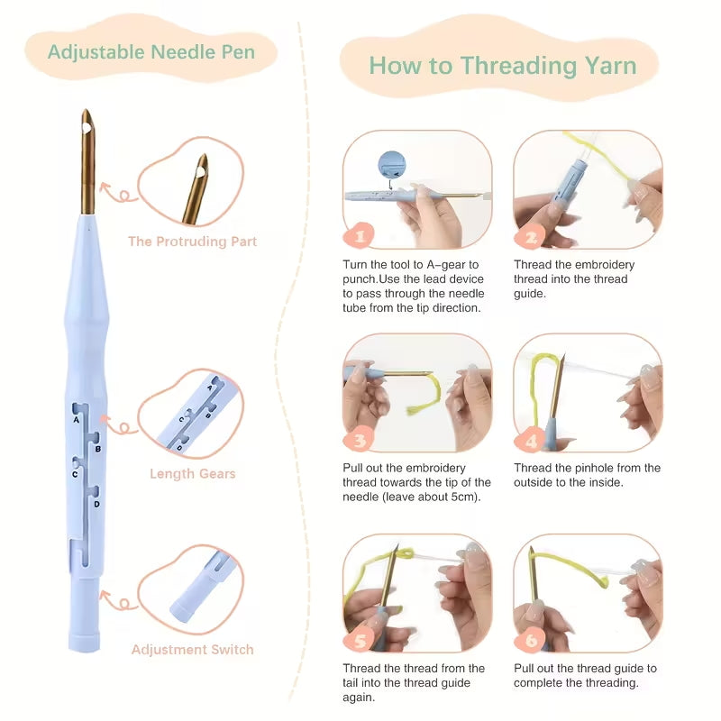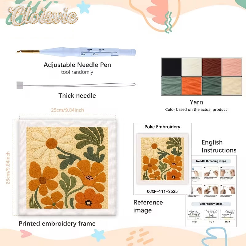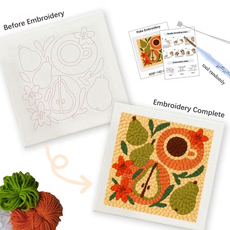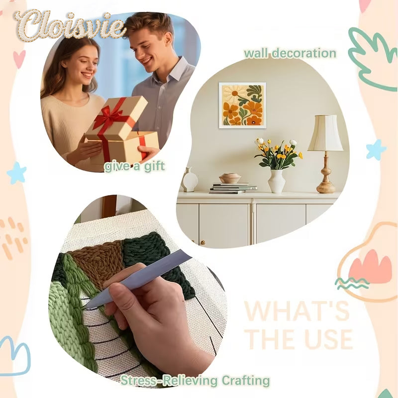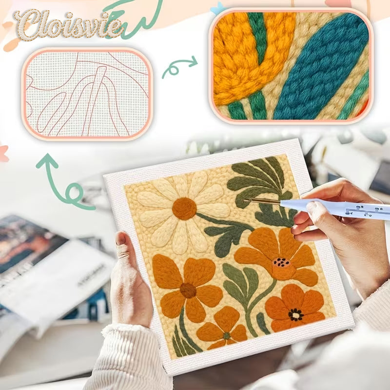 Our complete punch needle kit includes: 1x framed canvas with pre-printed design, 1x punch needle, 1x needle threading tool, 1x high-quality yarn, and 1x detailed guide— perfect for all skill levels!