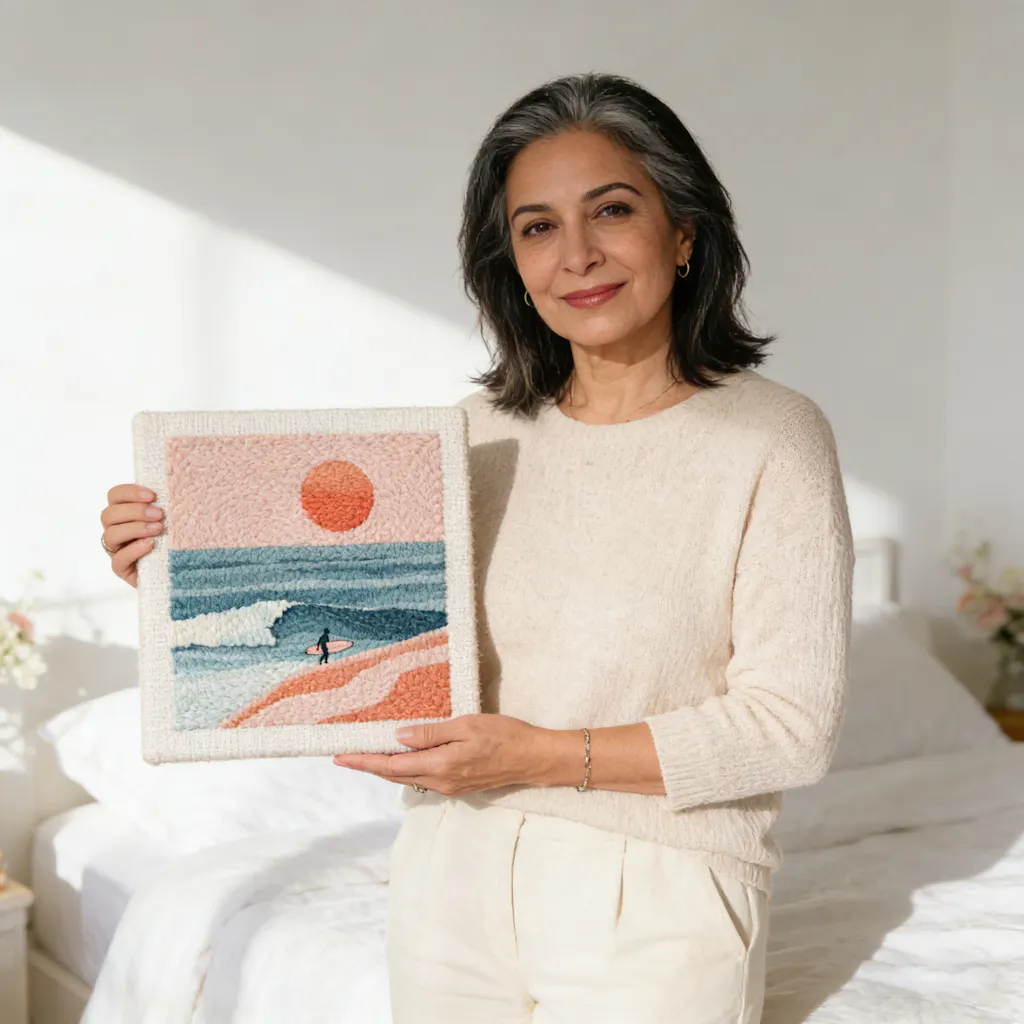 Our complete punch needle kit includes: 1x framed canvas with pre-printed design, 1x punch needle, 1x needle threading tool, 1x high-quality yarn, and 1x detailed guide— perfect for all skill levels!
